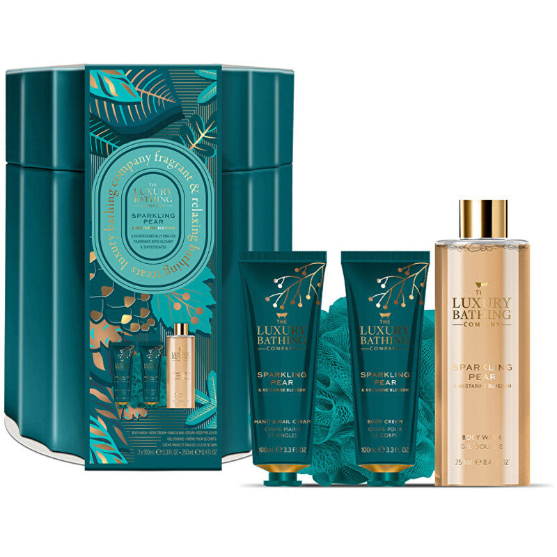 „Luxury Bathing Company“ kūno priežiūros dovanų rinkinys skardinėje dėžutėje (kriaušių ir nektarino žiedų)